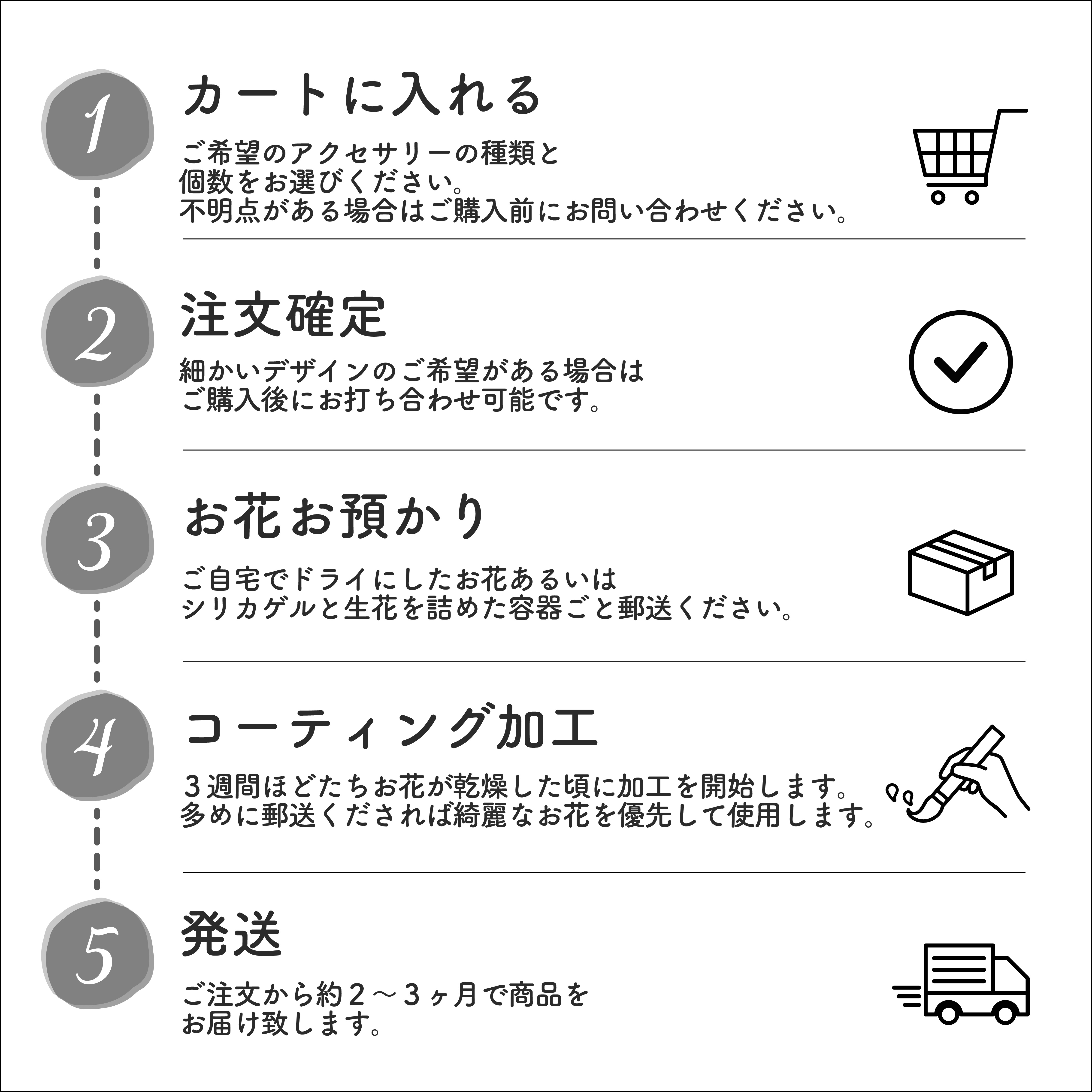 大切なお花を郵送にてお預かりし、加工して返送いたします。 【デザイン】ボリューム感や組み合わせ等のご希望をヒアリングしてお作りします。  【コーティング】レジンとエポキシ樹脂、艶消し塗料で硬くコーティングします。自然素材なのでお花のお色を永久に保存することは出来かねますがコーティングにより格段に色も形も長持ちします。お花の薄い・細い部分は脆いこともありますので取り扱いにご注意ください。しっかり強度を確認しながら制作します。 【保証期間】納品後1ヶ月は無償でお直しいたします。